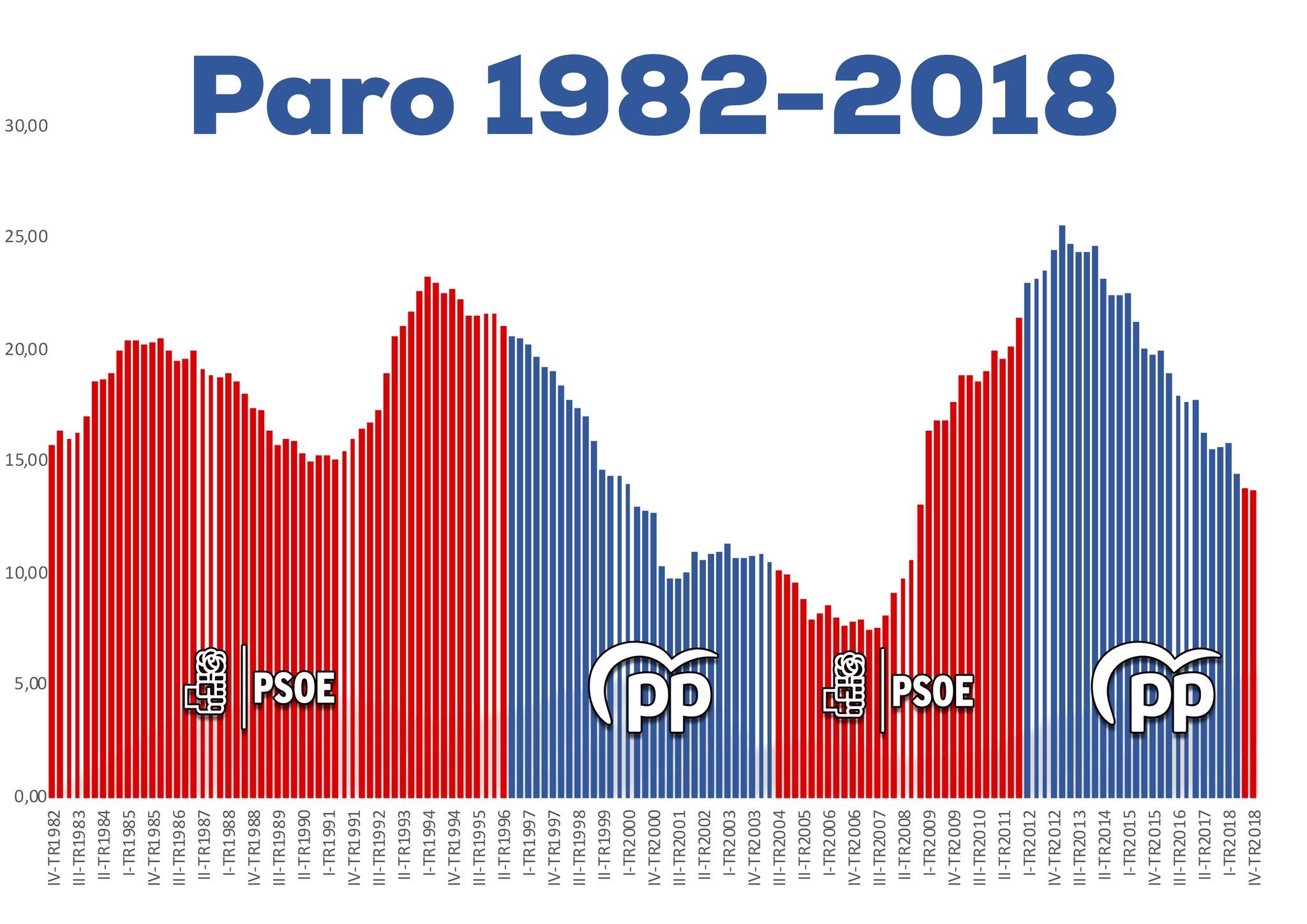 [*2*] Con ZP: Crisis mundial, se disparó el paro de forma generalizada en todo el mundo. En España nos vinimos al carajo más que otros porque la burbuja inmobiliara de Aznar explotó. Se te ha olvidado poner los últimos años de la gráfica donde a pesar del covid y de las crisis de energía y de Ucrania seguimos bajando el paro campeón.