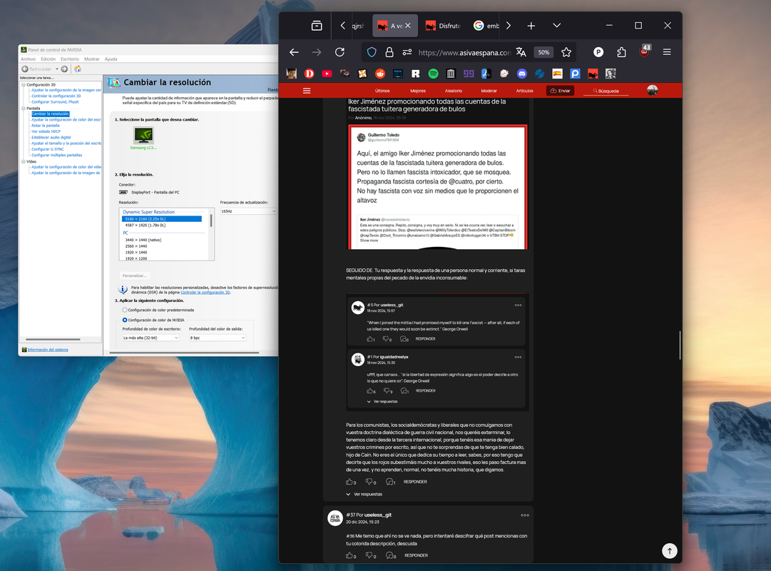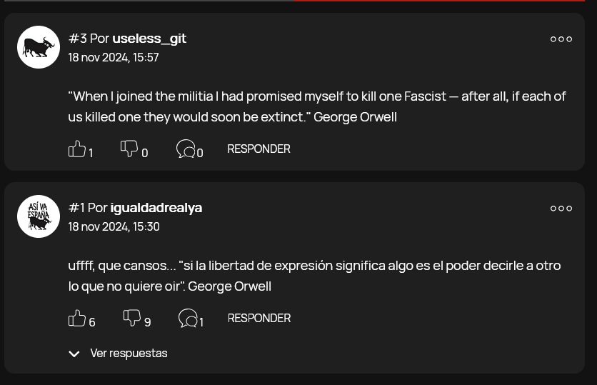 [*36*] Ya lo he encontrado, que en respuestas sólo se veía miniatura. Si no pillas el contexto, ningún problema en explicar. Al ver que alguien se apropiaba de una cita de Orwell (que, por algún motivo desconocido te empeñas en calificar erróneamente de "anarquista conservador), respondí con otra cita suya. Si no te parece bien la cita, te invito a que vuelvas a la cita original que puso la otra persona.