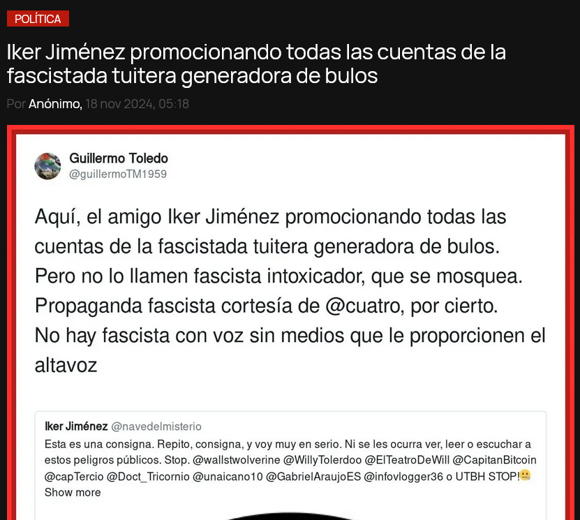 Pero tampoco lo vamos a dejarlo en manos de una panda de COMUNISTAS iletradas, analfabetas, demagogas, que solo buscan division y voto fácil, populismo barato Naródnik, Bolchevismo, guerra de sexos, y Neolenguaje sacado de lo que parece el INGSOC de 1984 (por cierto, novela que muchos tankies como @useless_git citan y ni se leen han leído la sinopsis).